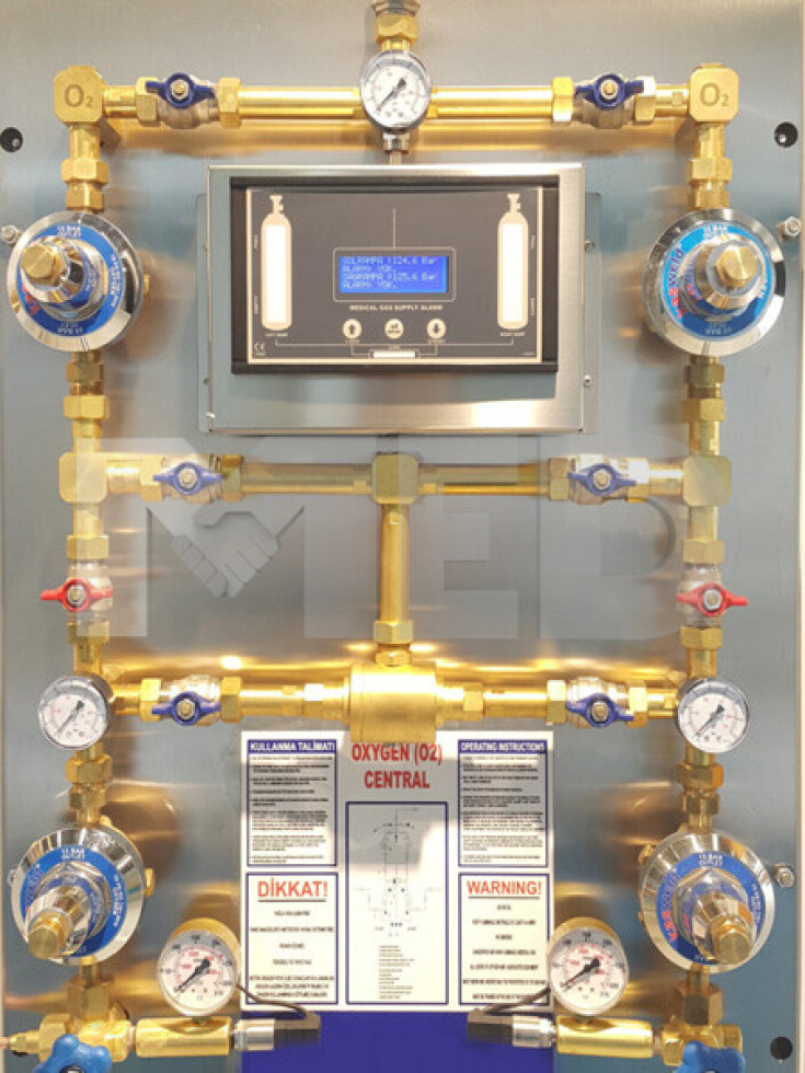 Centrale bouteilles à inversion automatique (Oxygène médical, Air médical et Protoxyde d'azote) avec une alarme numérique et sonore. A partir de 2.600.000 FCFA vous combinez le nombre de bouteilles par source